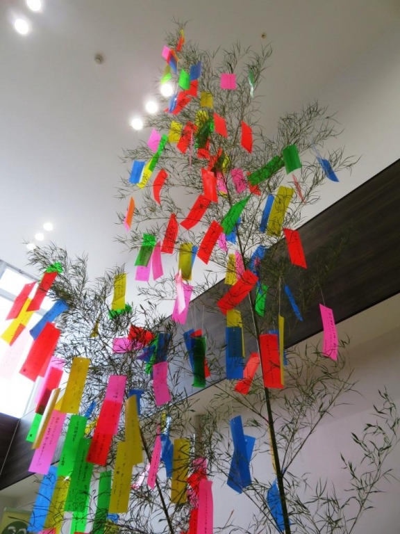 今年も玄関ロビー横にて笹の飾りつけを行いました。2本の笹には患者さんやスタッフの願い事が書かれた短冊がびっしりとくくりつけられました。