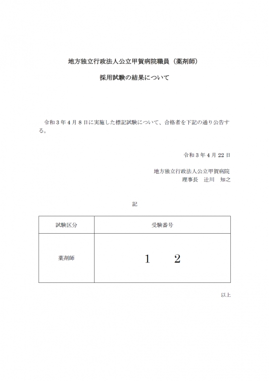 ※当院の掲示板又は、合格者に送付する通知書で正式にご確認ください。