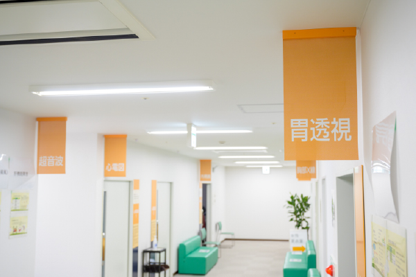 受付、待合室、更衣室、採血・採尿・聴力・眼圧・眼底・視力・胸部写真・超音波・心電図・肺活量・胃透視・胃内視鏡の各検査スペース、診察室、一泊ドック受診者控え室及び保健指導室が同エリア内にあります。